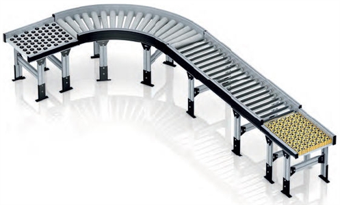 根據(jù)實際空間位置,滾筒輸送線設(shè)計了一個90°的彎道滾筒輸送線結(jié)構(gòu)。而對于彎道滾筒輸送線的動力驅(qū)動,決定應(yīng)用將電機和減速器共同置于輥筒體內(nèi)部的新型驅(qū)動裝置——電動滾筒。為了形成滾筒彎道,設(shè)計時采用錐形電動滾筒。